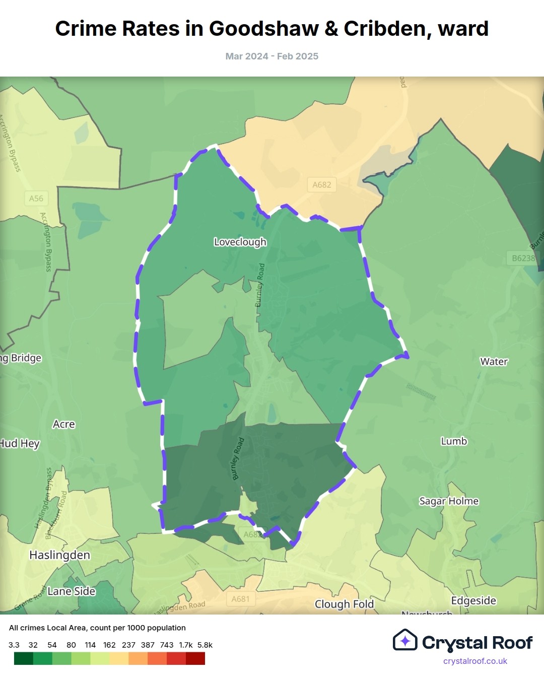 The figures in grey indicate the relative ratings of Goodshaw & Cribden (ward) for a specific crime type compared to other wards in England and Wales.