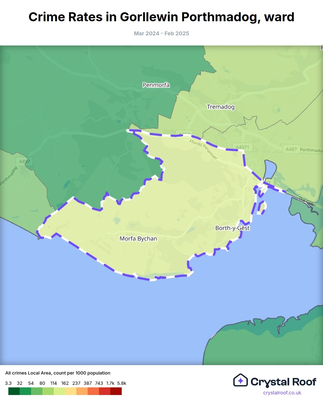 Gorllewin Porthmadog, (ward) includes areas with the following crime ratings (see map):