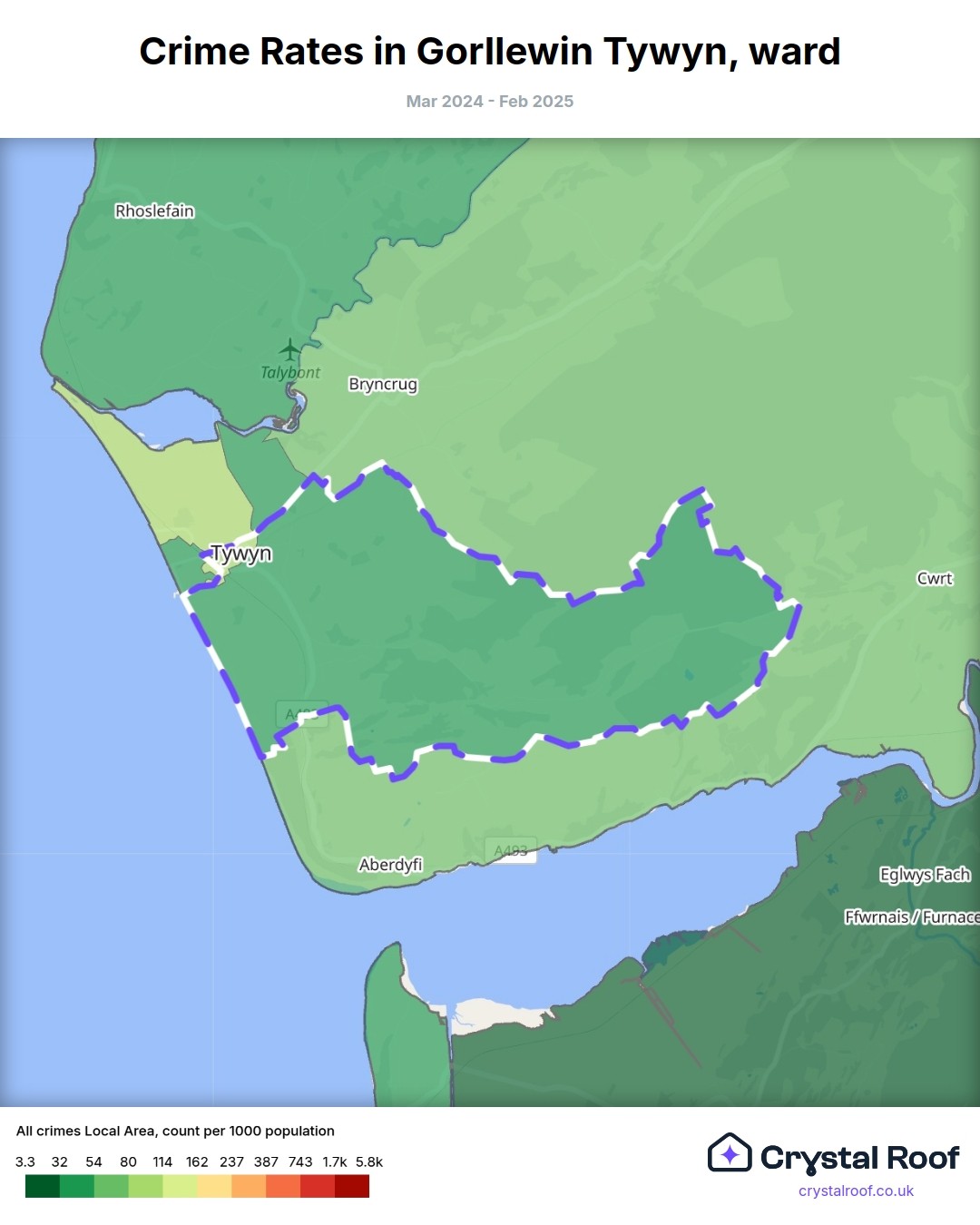 The figures in grey indicate the relative ratings of Gorllewin Tywyn (ward) for a specific crime type compared to other wards in England and Wales.