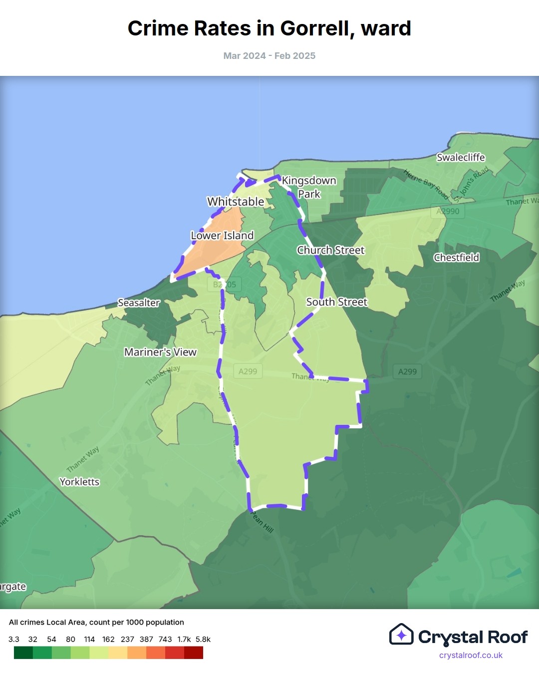 Gorrell (ward) is located within Canterbury (borough). Annual total crime rate in Canterbury (borough) is 108 crimes per thousand resident population, which can be rated as 5 out of 10 or medium crime level compared to other local authority districts in England and Wales.