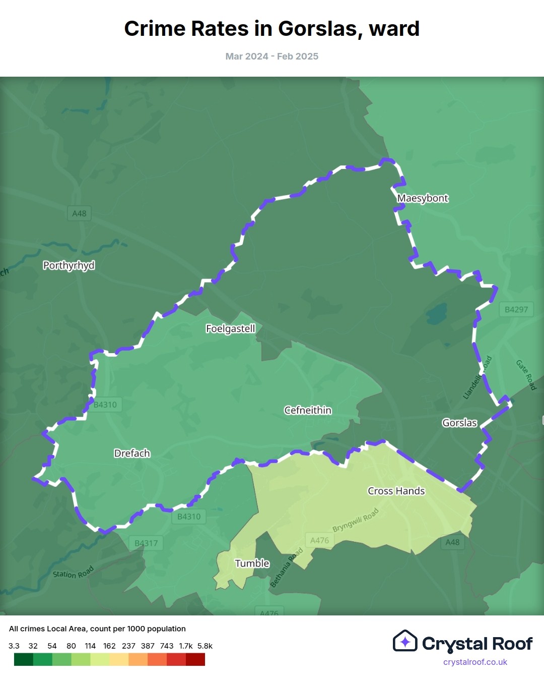 The figures in grey indicate the relative ratings of Gorslas (ward) for a specific crime type compared to other wards in England and Wales.