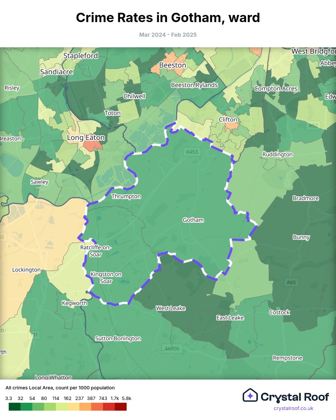 Gotham (ward) is located within Rushcliffe (borough). Annual total crime rate in Rushcliffe (borough) is 52.6 crimes per thousand resident population, which can be rated as 1 out of 10 or low crime level compared to other local authority districts in England and Wales.