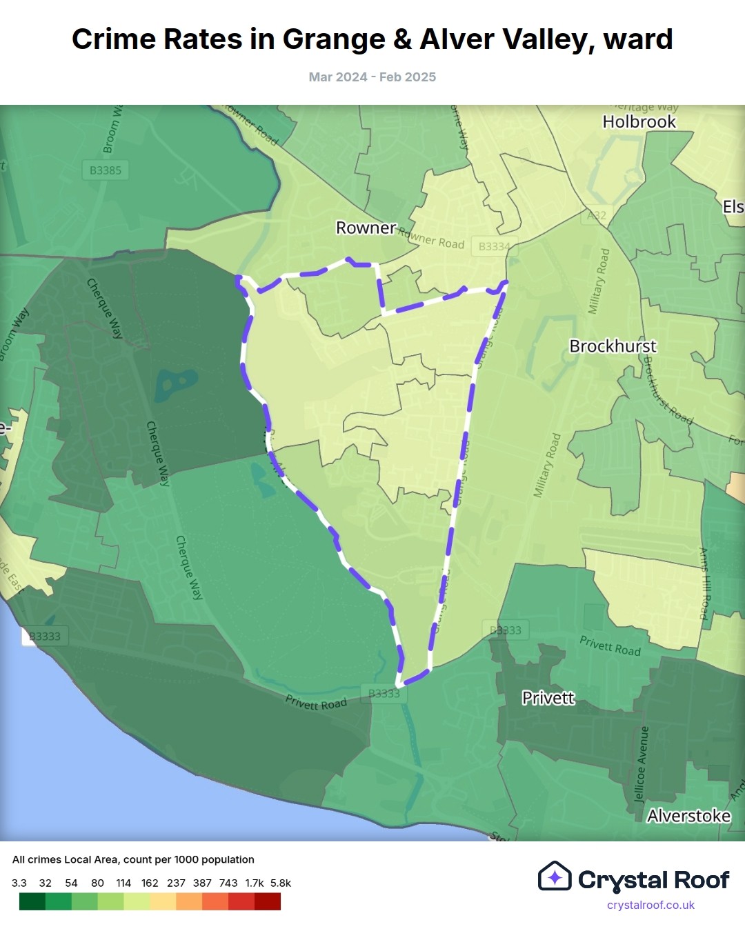 Grange & Alver Valley (ward) is located within Gosport (borough). Annual total crime rate in Gosport (borough) is 88.4 crimes per thousand resident population, which can be rated as 4 out of 10 or low crime level compared to other local authority districts in England and Wales.
