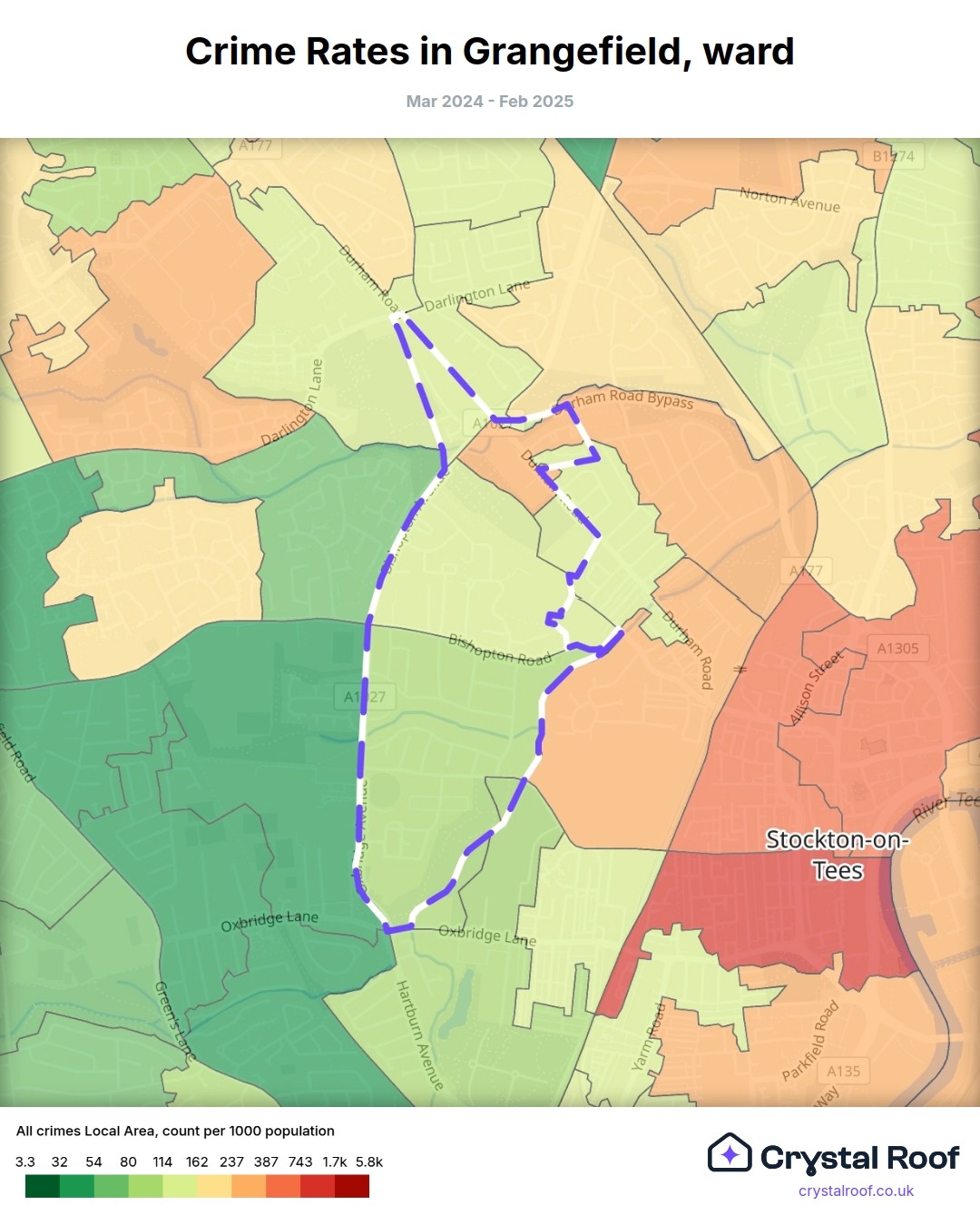 Grangefield (ward) is located within Stockton-on-Tees (borough). Annual total crime rate in Stockton-on-Tees (borough) is 129 crimes per thousand resident population, which can be rated as 6 out of 10 or medium crime level compared to other local authority districts in England and Wales.