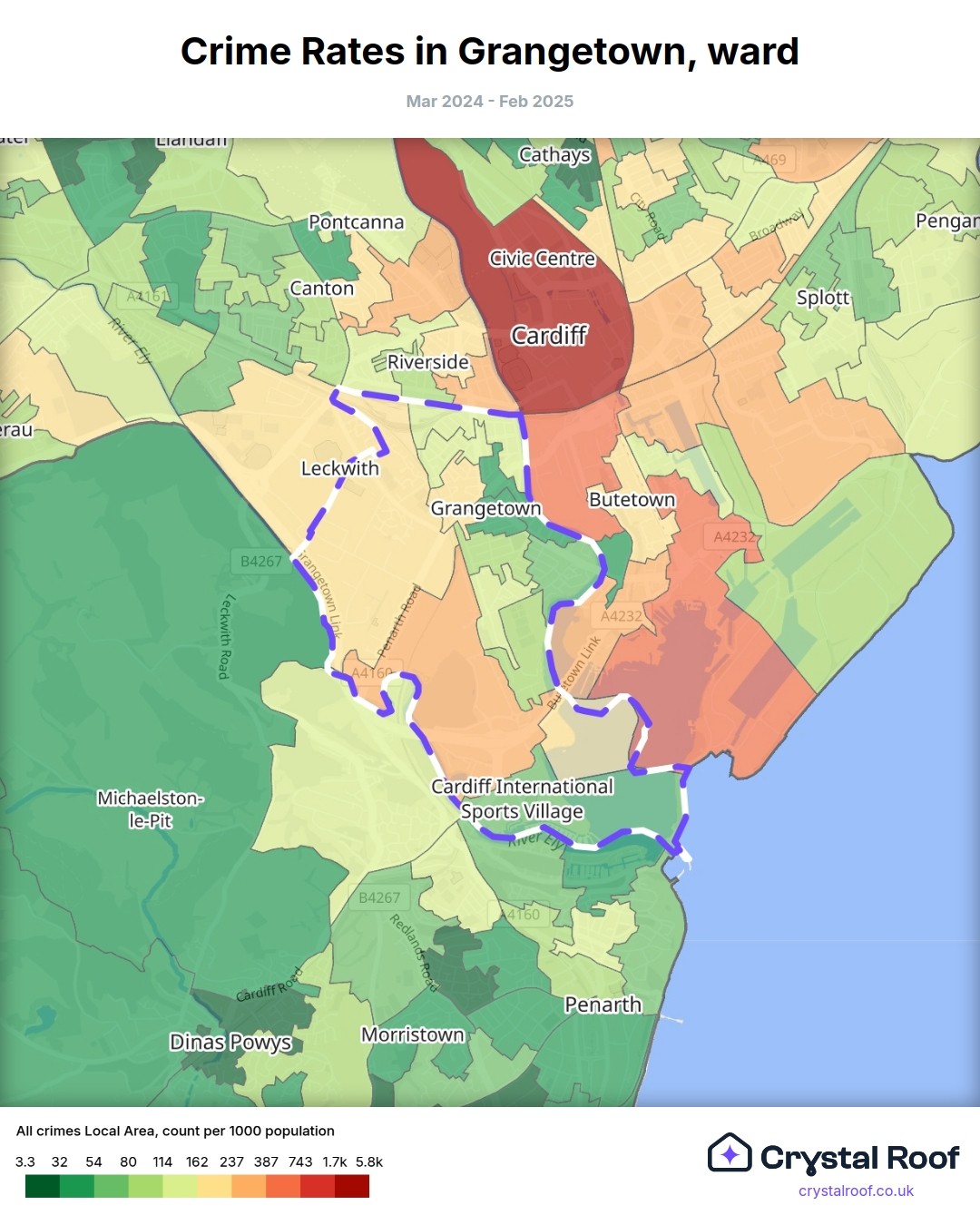 The figures in grey indicate the relative ratings of Grangetown (ward) for a specific crime type compared to other wards in England and Wales.