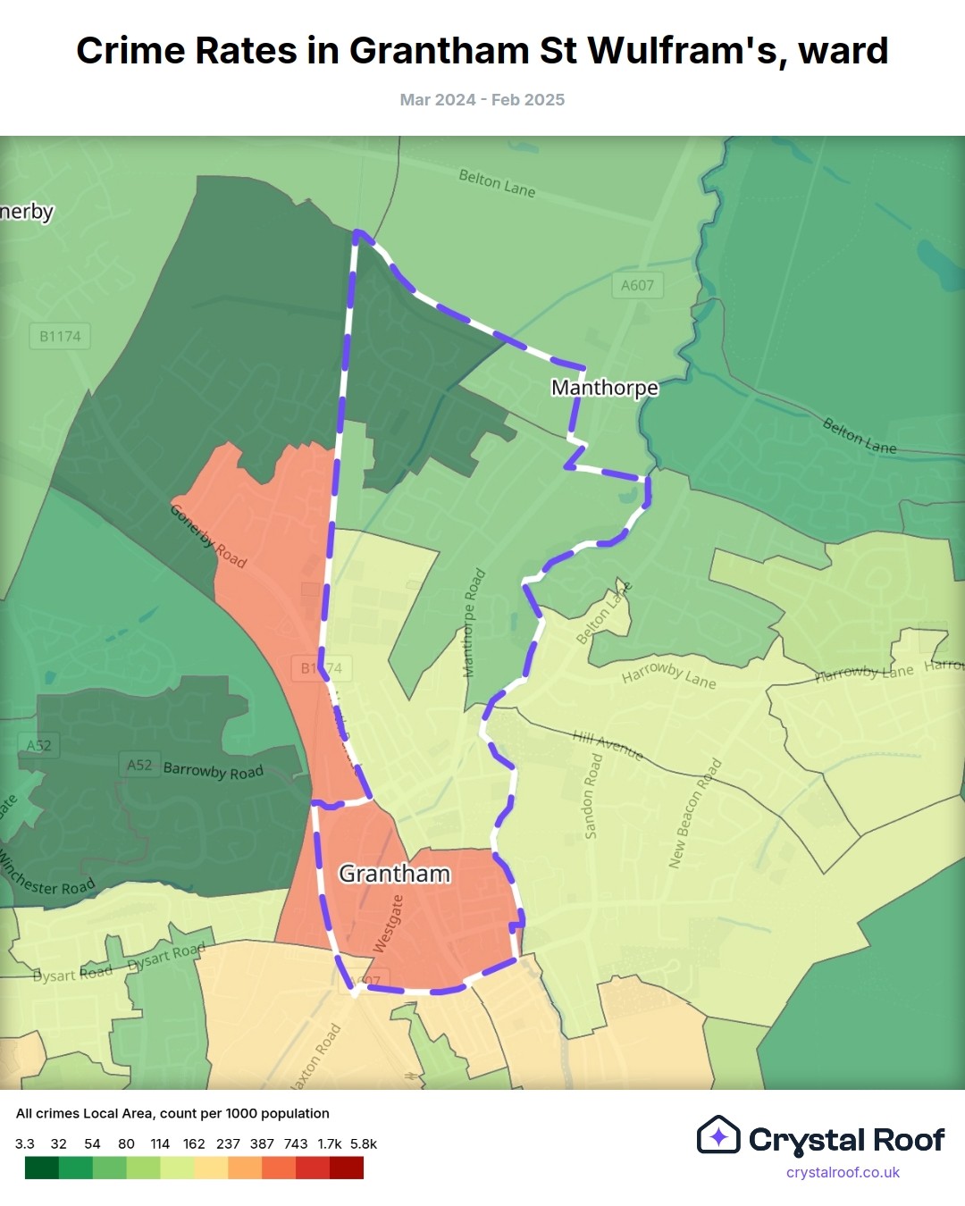 Grantham St Wulfram's, (ward) includes areas with the following crime ratings (see map):