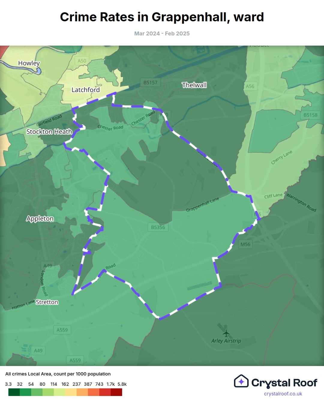 Grappenhall (ward) is located within Warrington (borough). Annual total crime rate in Warrington (borough) is 71.2 crimes per thousand resident population, which can be rated as 2 out of 10 or low crime level compared to other local authority districts in England and Wales.