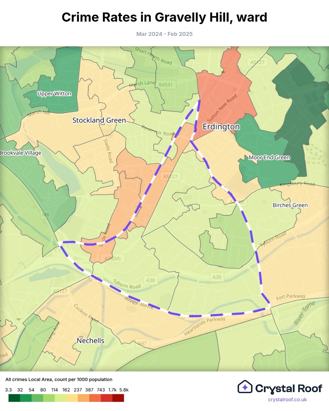 Gravelly Hill, (ward) includes areas with the following crime ratings (see map):
