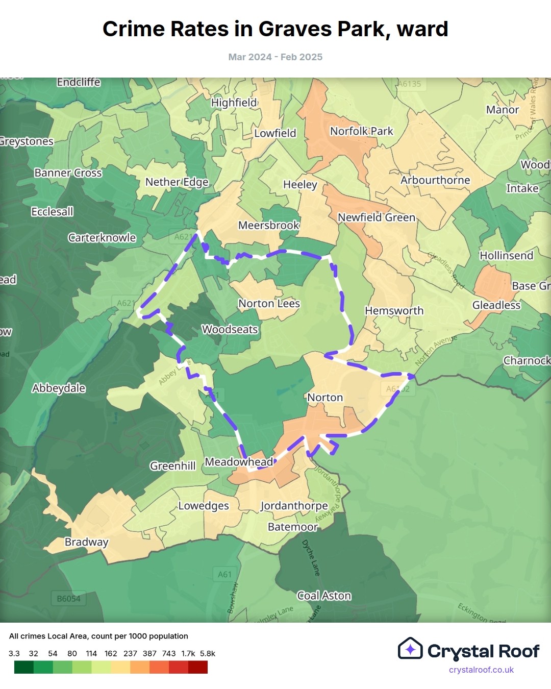 Graves Park, (ward) includes areas with the following crime ratings (see map):