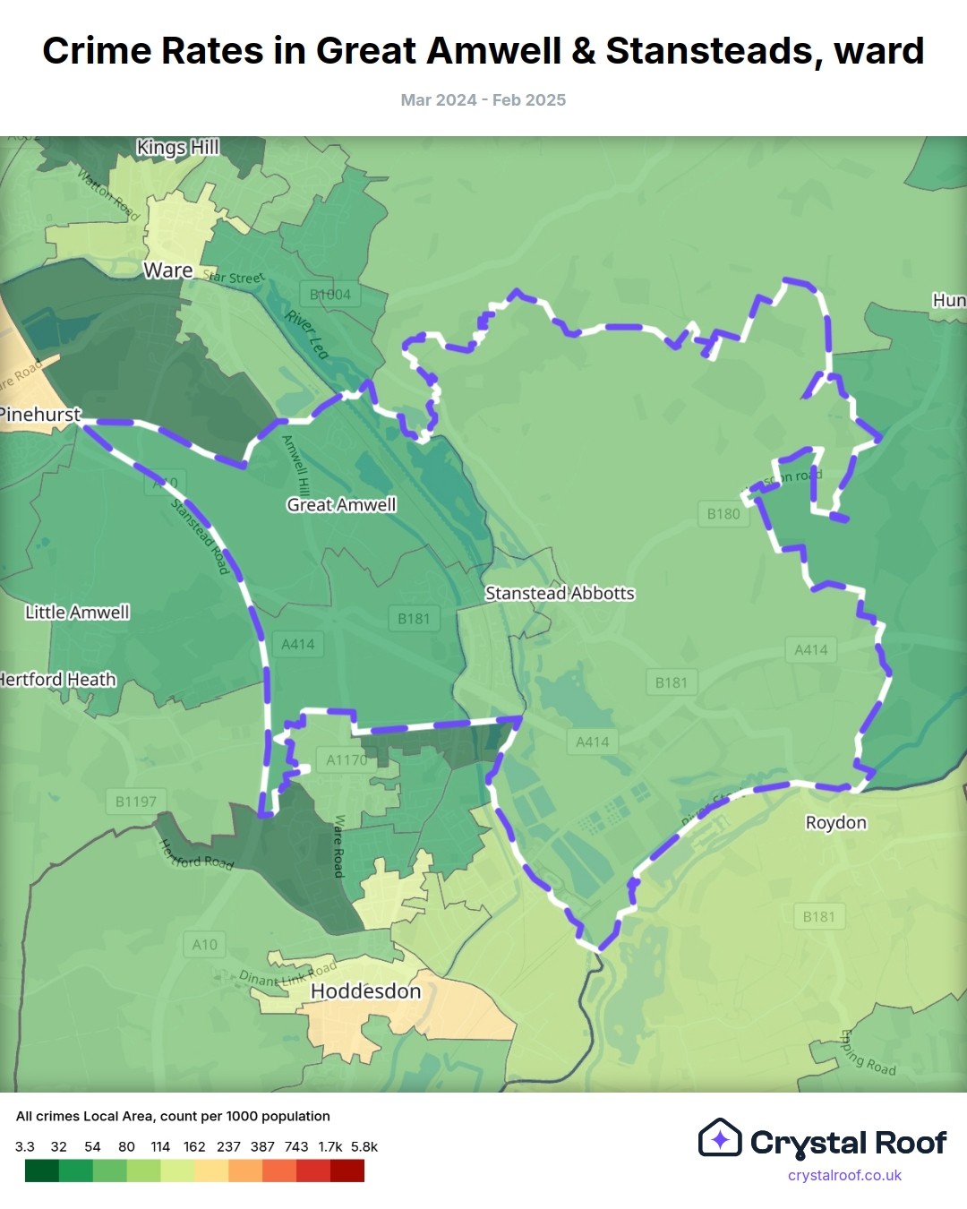 Great Amwell & Stansteads, (ward) includes areas with the following crime ratings (see map):