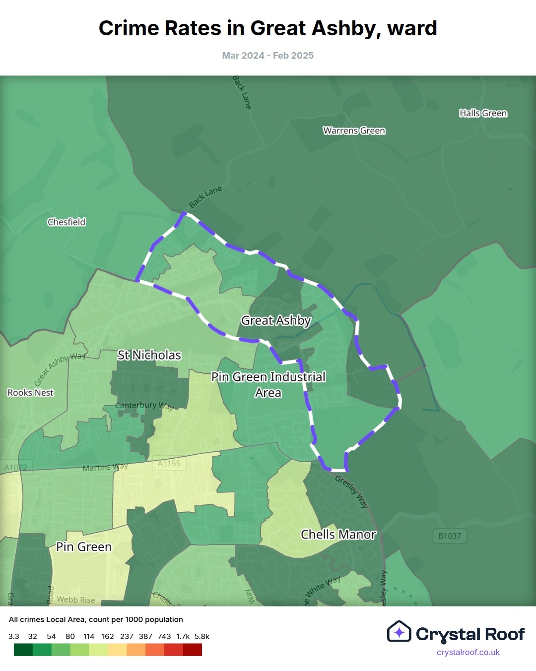 Great Ashby (ward) is located within North Hertfordshire (borough). Annual total crime rate in North Hertfordshire (borough) is 68.9 crimes per thousand resident population, which can be rated as 2 out of 10 or low crime level compared to other local authority districts in England and Wales.