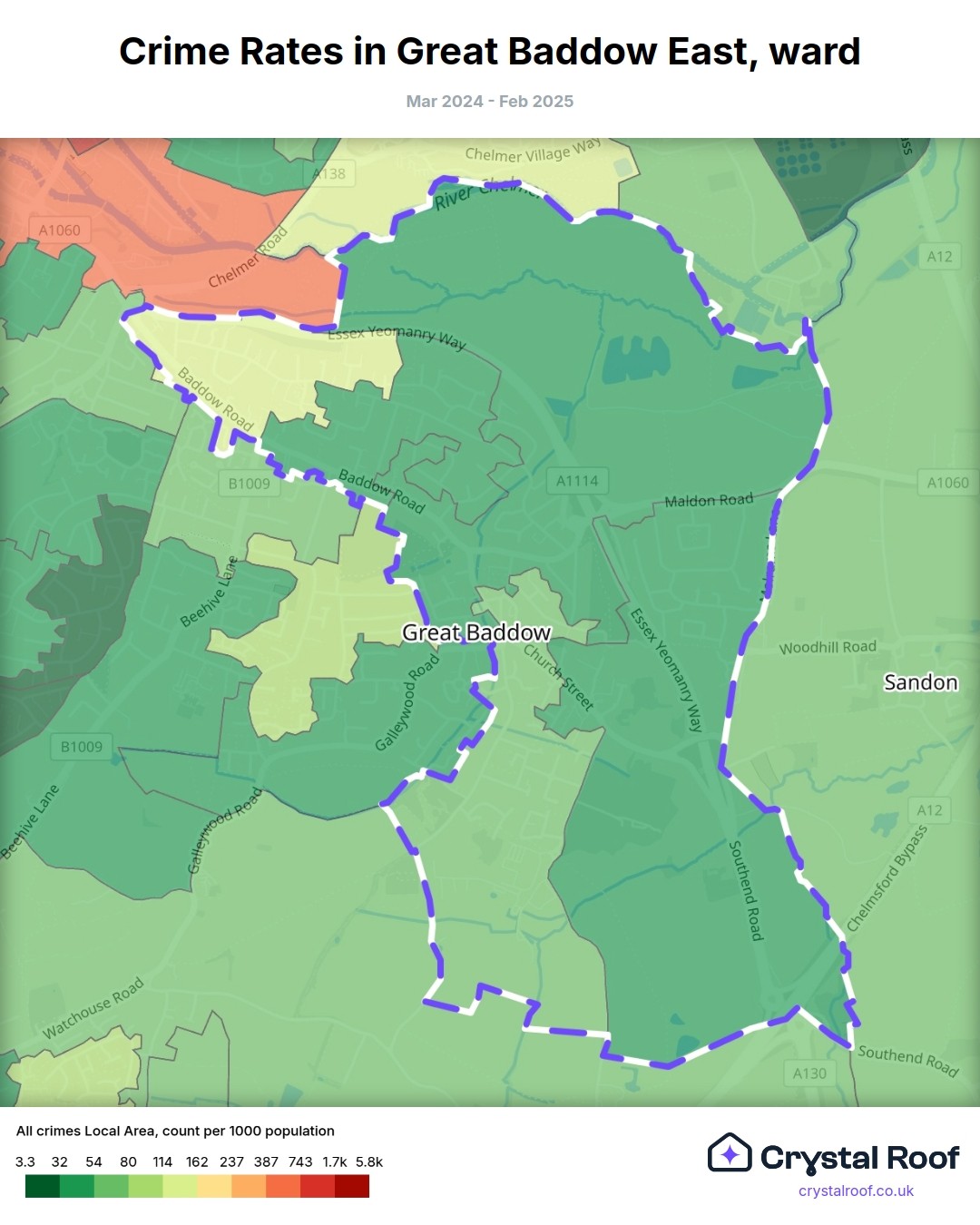 Great Baddow East, (ward) includes areas with the following crime ratings (see map):