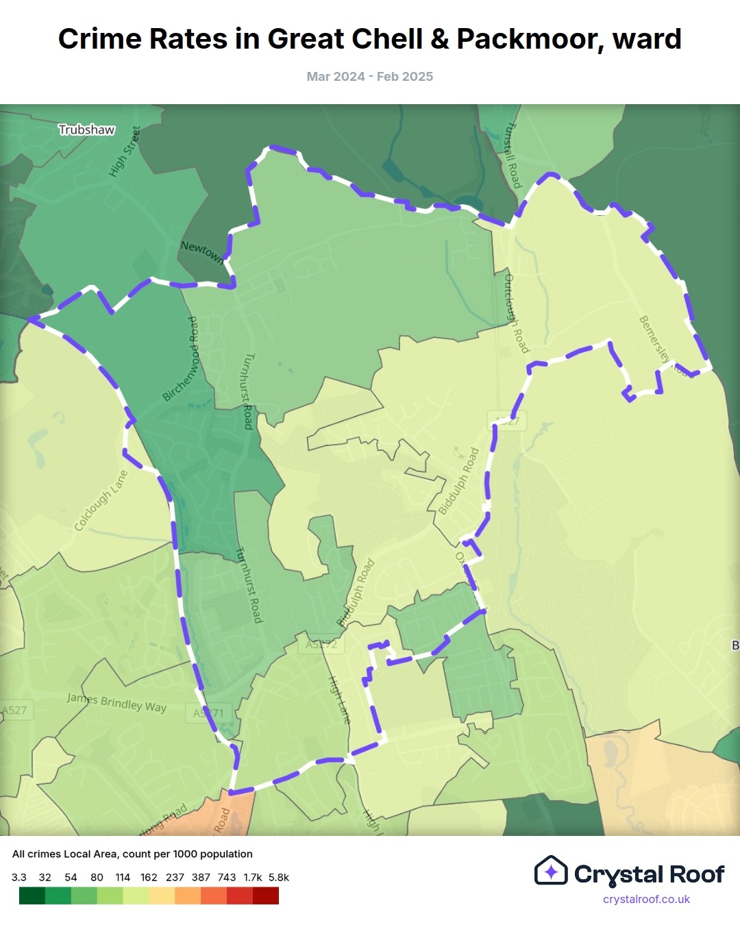 Great Chell & Packmoor, (ward) includes areas with the following crime ratings (see map):
