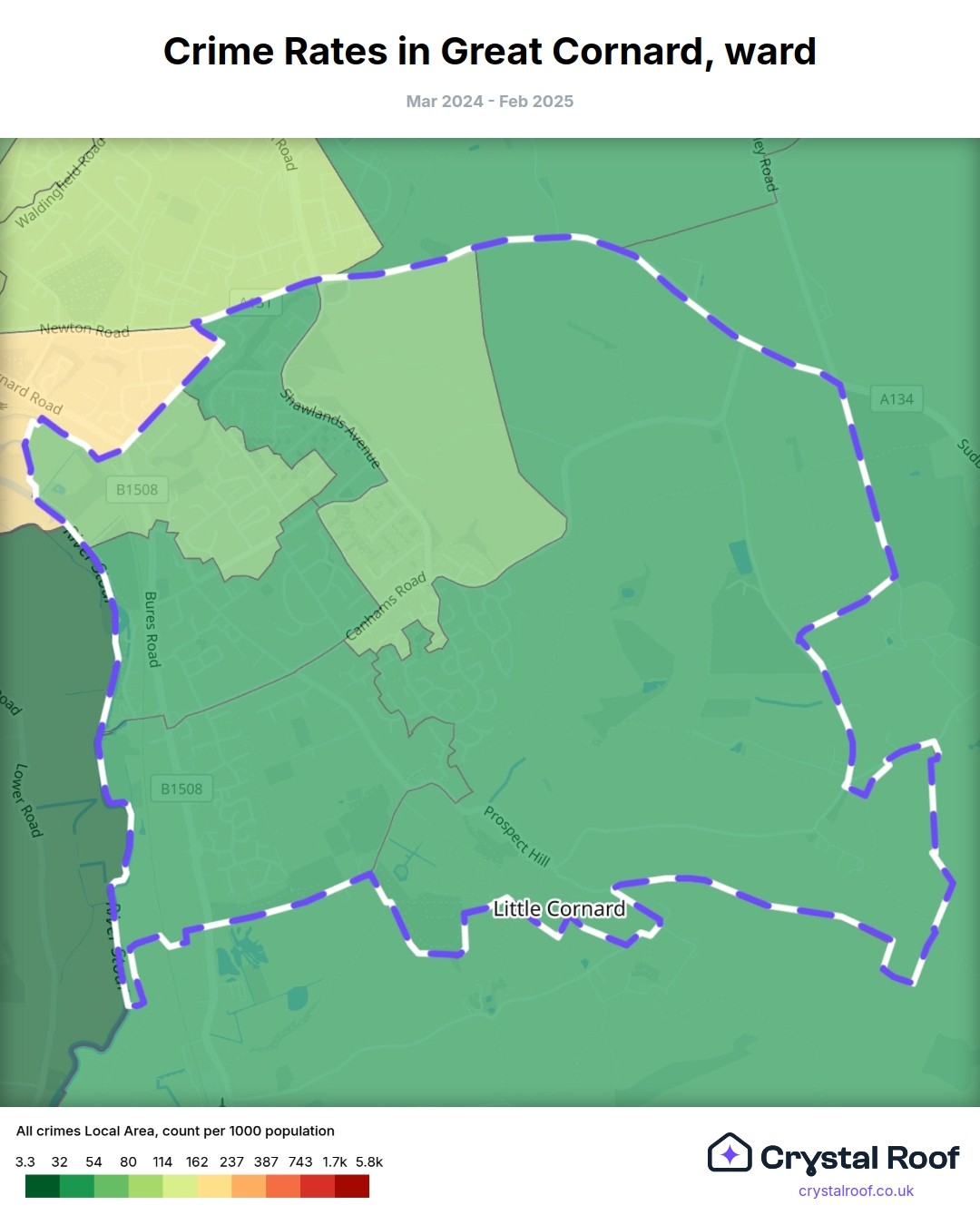 Great Cornard, (ward) includes areas with the following crime ratings (see map):