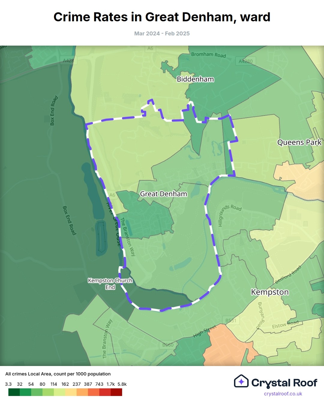 The figures in grey indicate the relative ratings of Great Denham (ward) for a specific crime type compared to other wards in England and Wales.