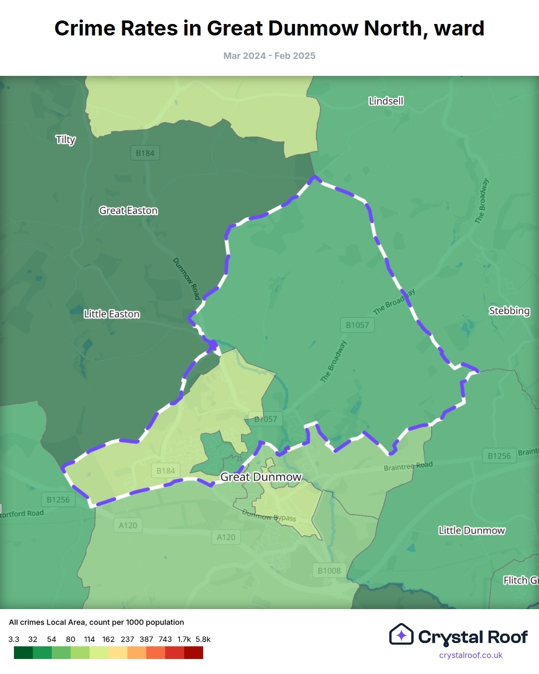 Great Dunmow North, (ward) includes areas with the following crime ratings (see map):