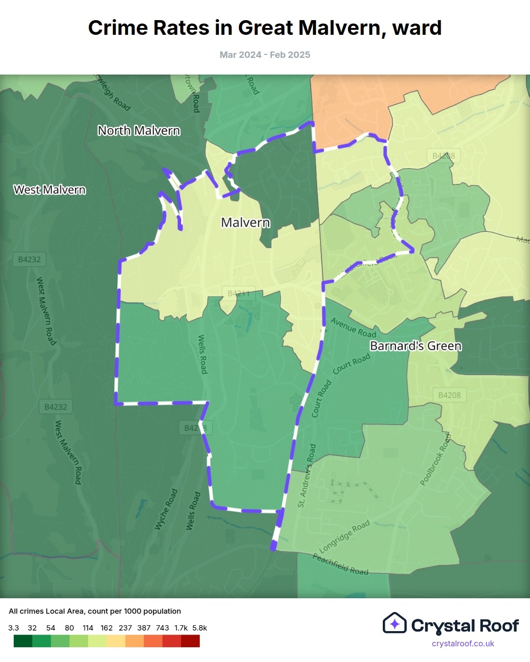 Great Malvern, (ward) includes areas with the following crime ratings (see map):