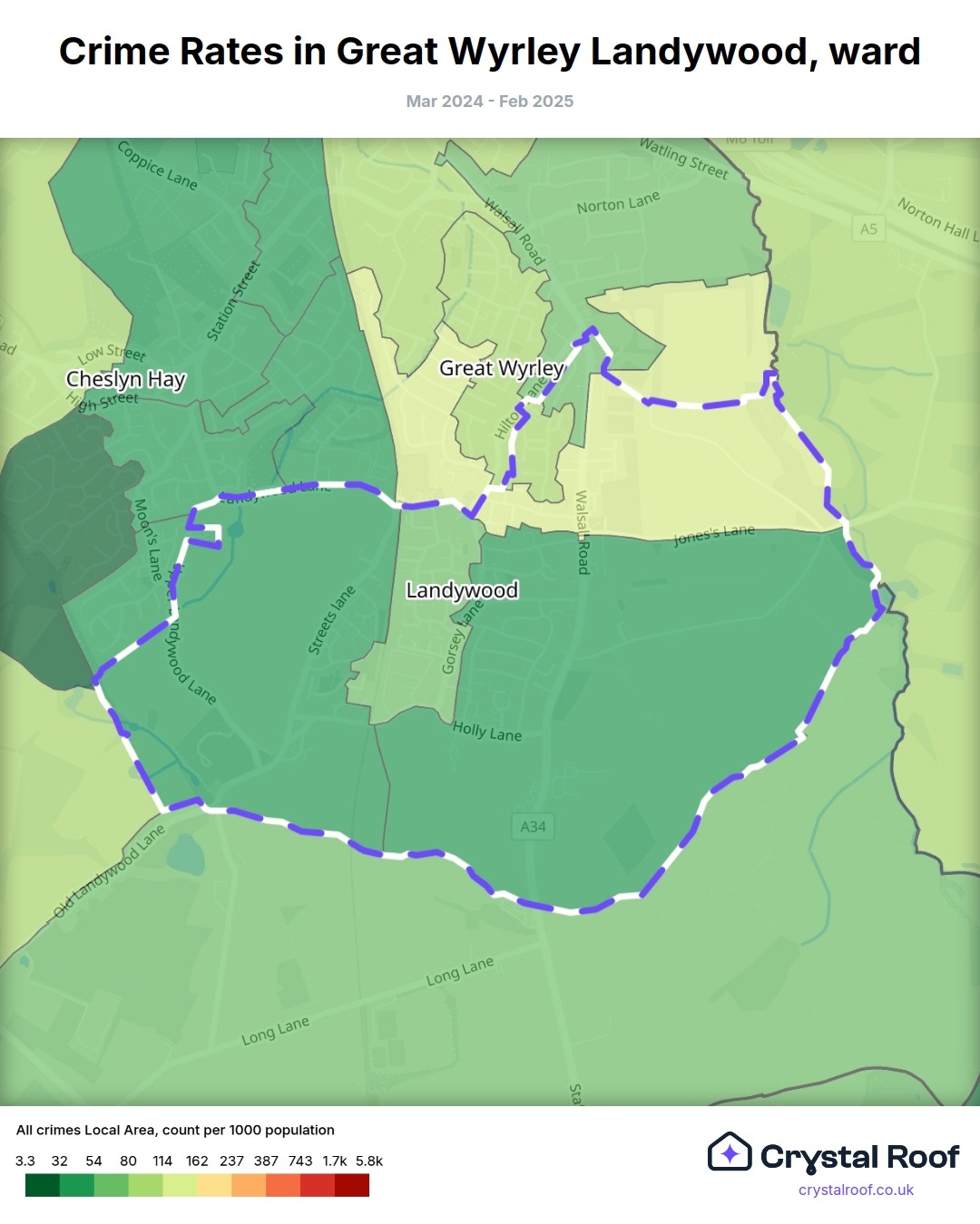 Great Wyrley Landywood, (ward) includes areas with the following crime ratings (see map):