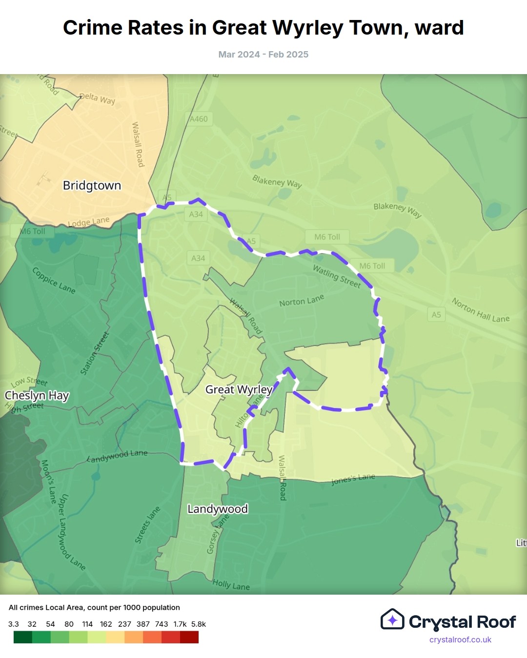 The figures in grey indicate the relative ratings of Great Wyrley Town (ward) for a specific crime type compared to other wards in England and Wales.