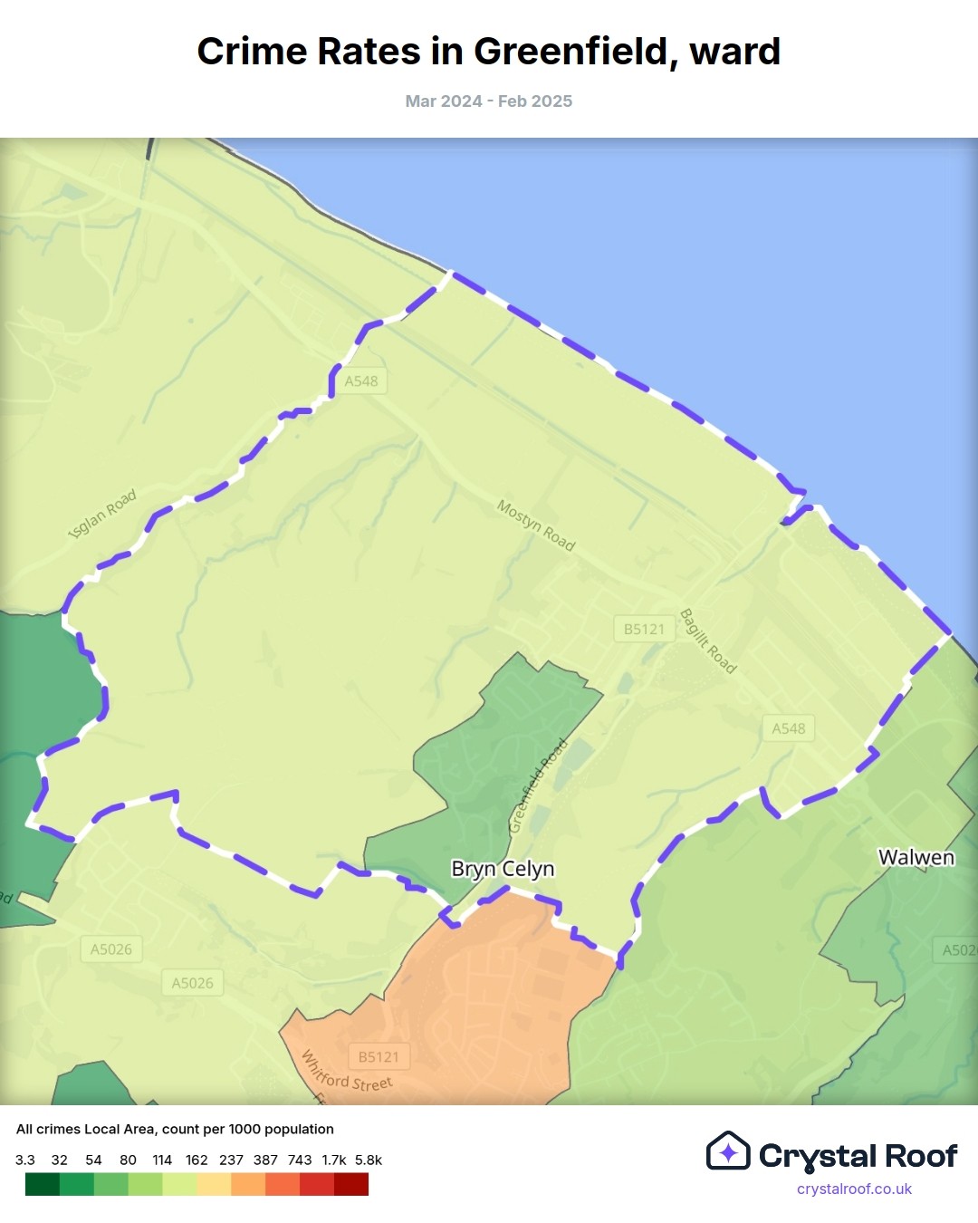 Greenfield (ward) is located within Flintshire (borough). Annual total crime rate in Flintshire (borough) is 79.5 crimes per thousand resident population, which can be rated as 3 out of 10 or low crime level compared to other local authority districts in England and Wales.
