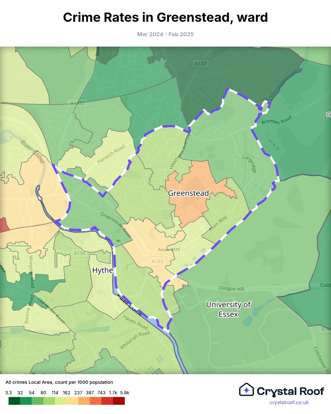 The figures in grey indicate the relative ratings of Greenstead (ward) for a specific crime type compared to other wards in England and Wales.