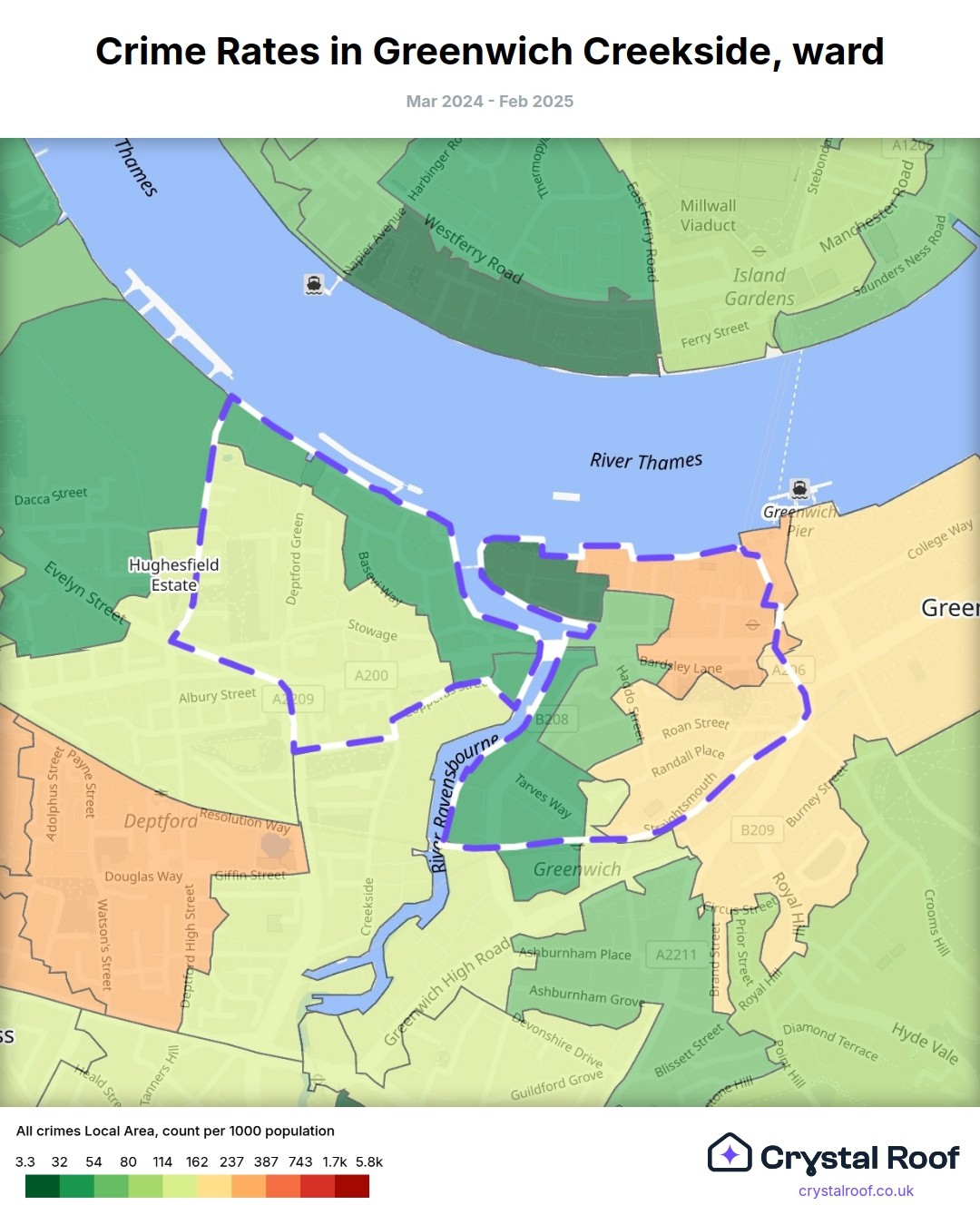 Greenwich Creekside, (ward) includes areas with the following crime ratings (see map):
