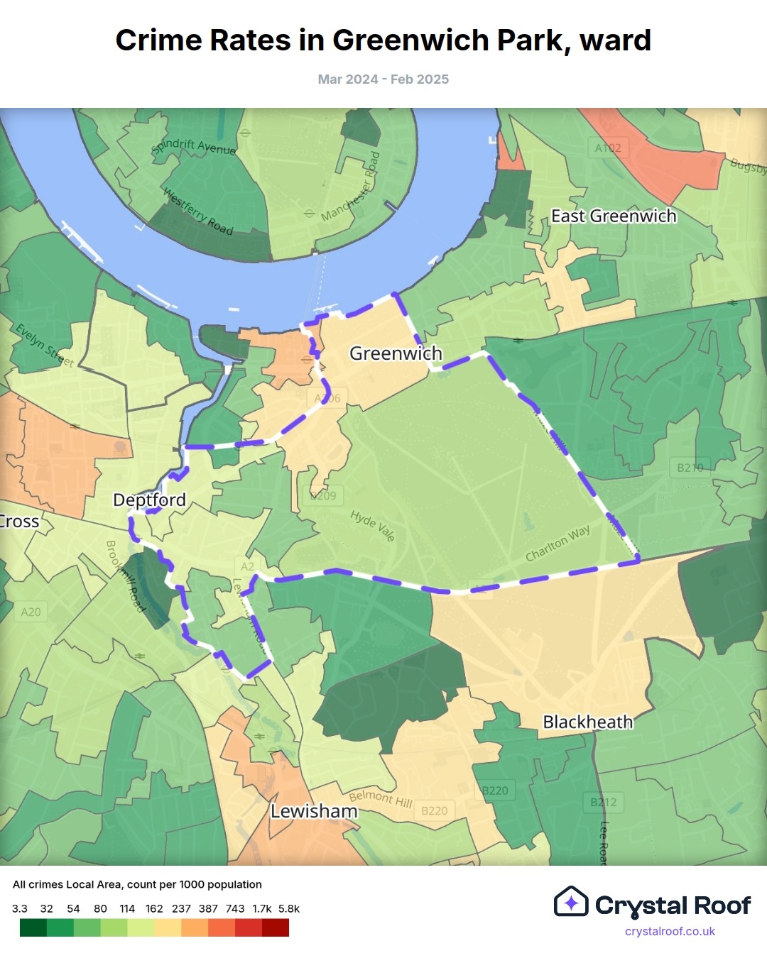 Greenwich Park, (ward) includes areas with the following crime ratings (see map):