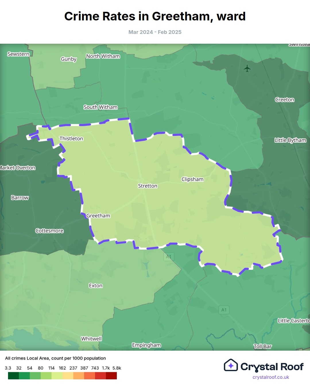 The figures in grey indicate the relative ratings of Greetham (ward) for a specific crime type compared to other wards in England and Wales.