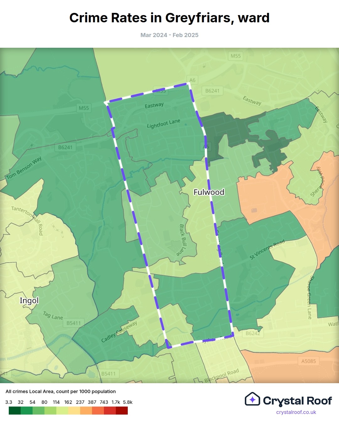Greyfriars (ward) is located within Preston (borough). Annual total crime rate in Preston (borough) is 153 crimes per thousand resident population, which can be rated as 7 out of 10 or high crime level compared to other local authority districts in England and Wales.