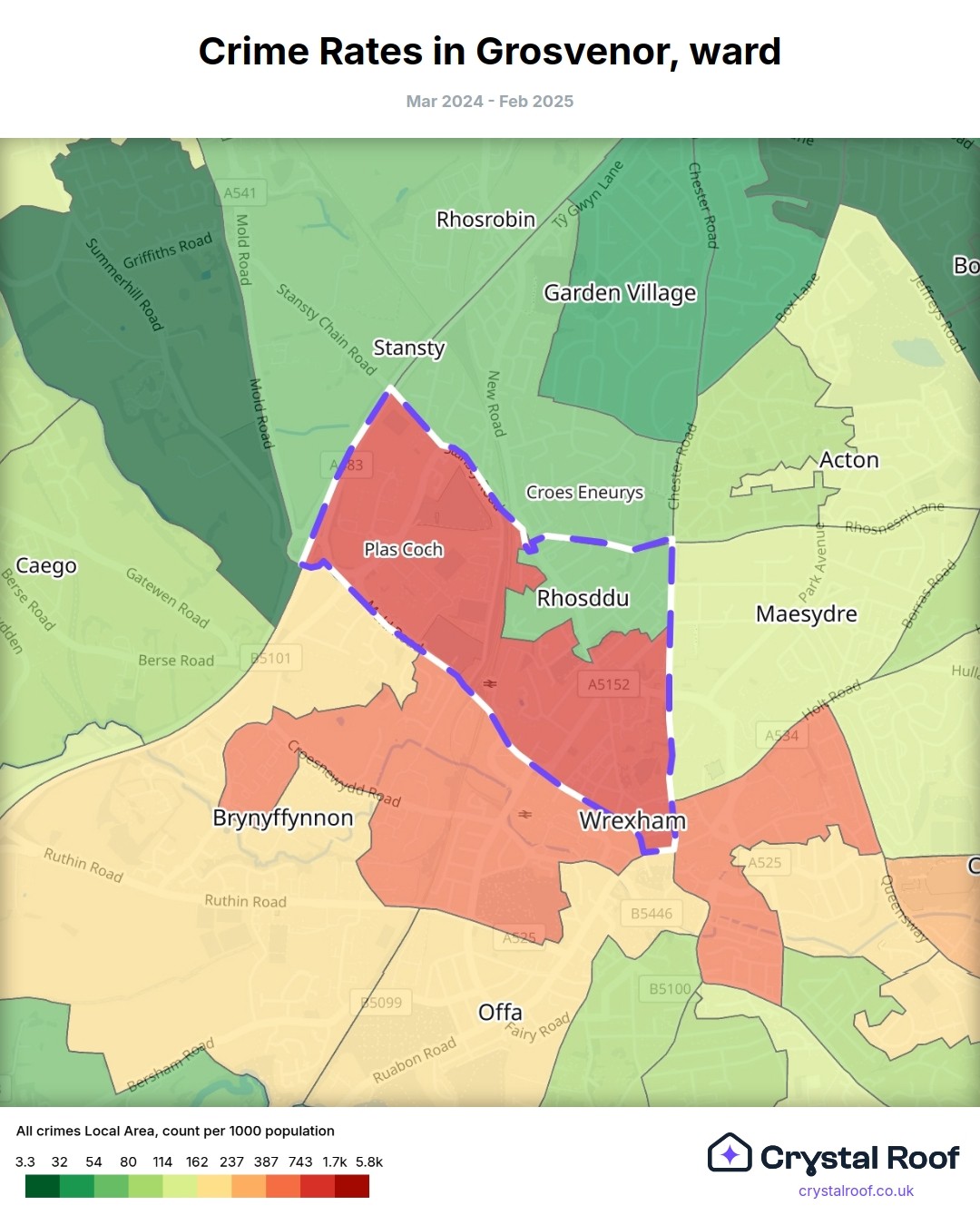Grosvenor (ward) is located within Wrexham (borough). Annual total crime rate in Wrexham (borough) is 105 crimes per thousand resident population, which can be rated as 5 out of 10 or medium crime level compared to other local authority districts in England and Wales.