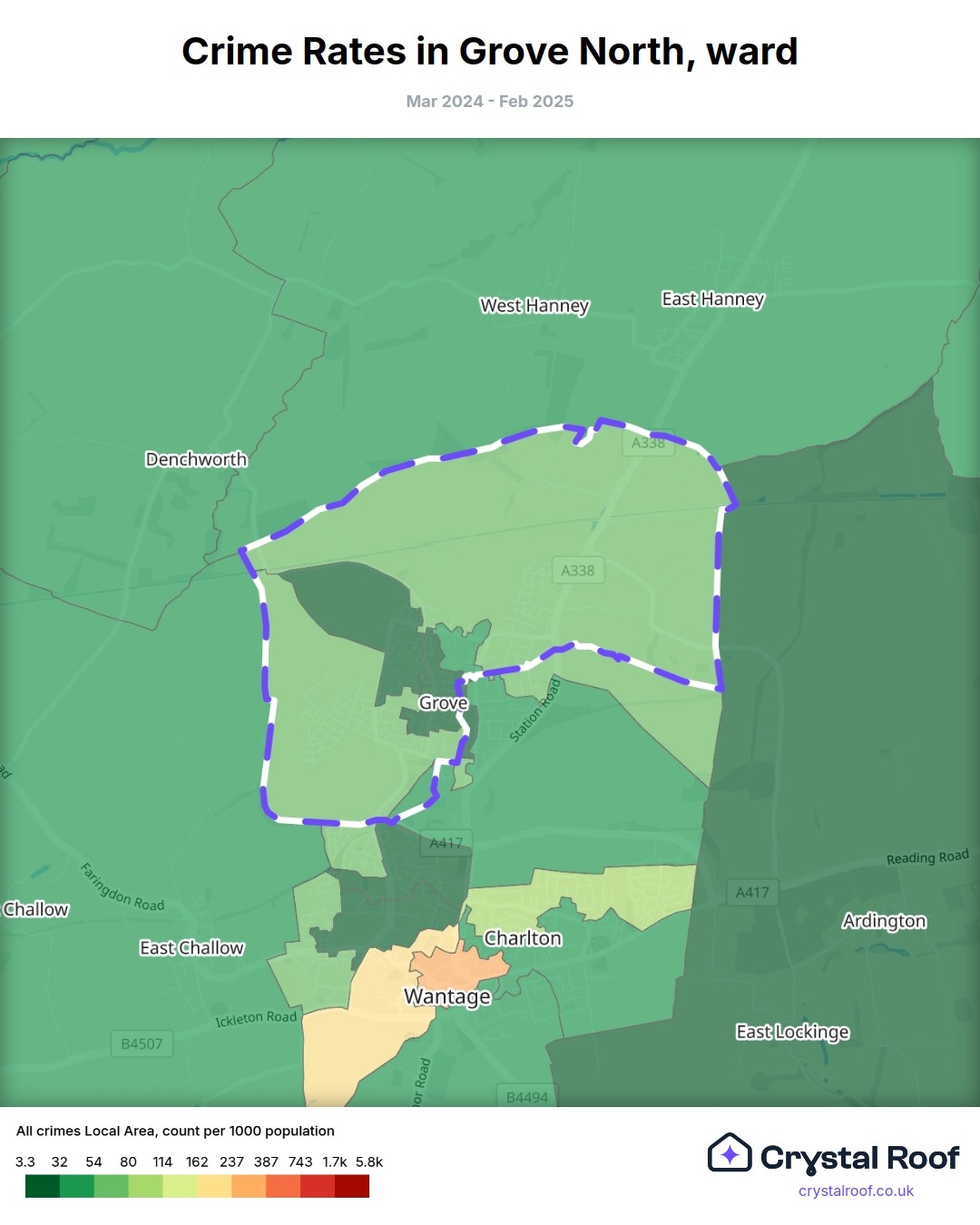 Grove North (ward) is located within Vale of White Horse (borough). Annual total crime rate in Vale of White Horse (borough) is 58.9 crimes per thousand resident population, which can be rated as 2 out of 10 or low crime level compared to other local authority districts in England and Wales.
