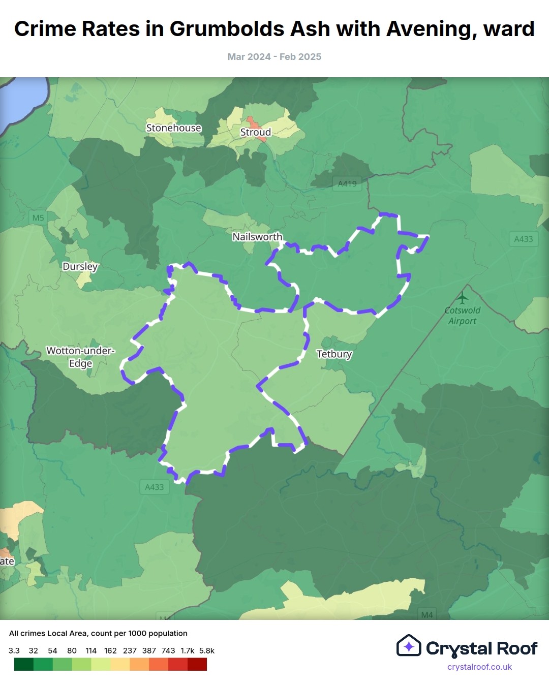 Grumbolds Ash with Avening, (ward) includes areas with the following crime ratings (see map):