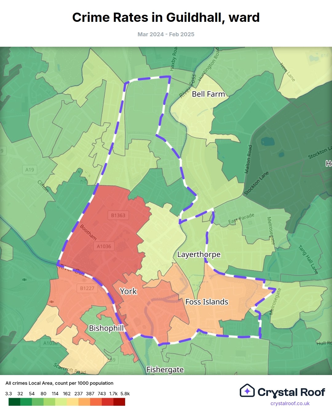 Guildhall (ward) is located within York (borough). Annual total crime rate in York (borough) is 68 crimes per thousand resident population, which can be rated as 2 out of 10 or low crime level compared to other local authority districts in England and Wales.