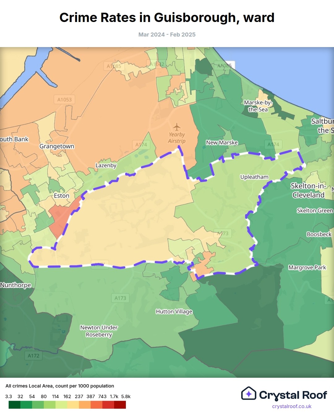 Guisborough, (ward) includes areas with the following crime ratings (see map):
