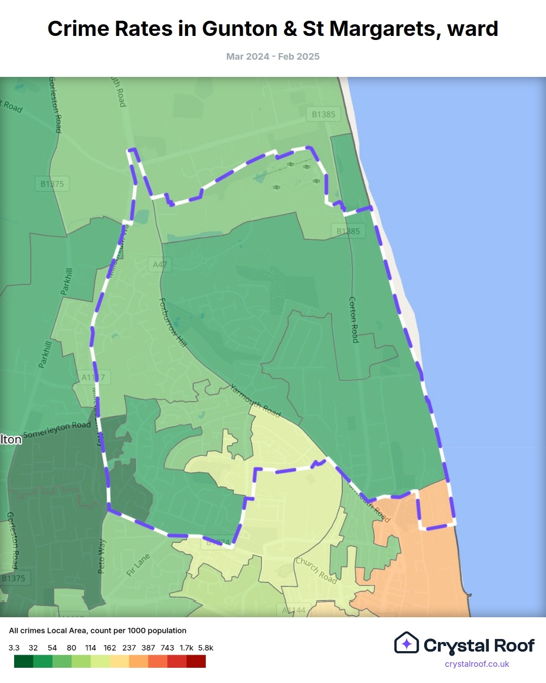 Gunton & St Margarets, (ward) includes areas with the following crime ratings (see map):