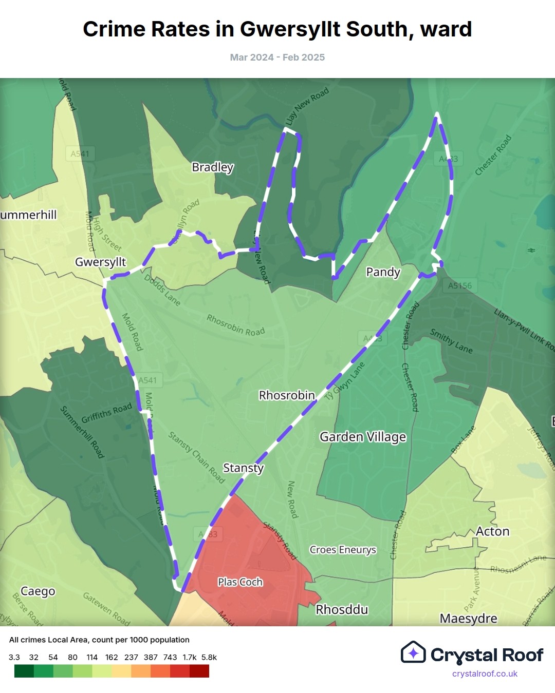 Gwersyllt South, (ward) includes areas with the following crime ratings (see map):