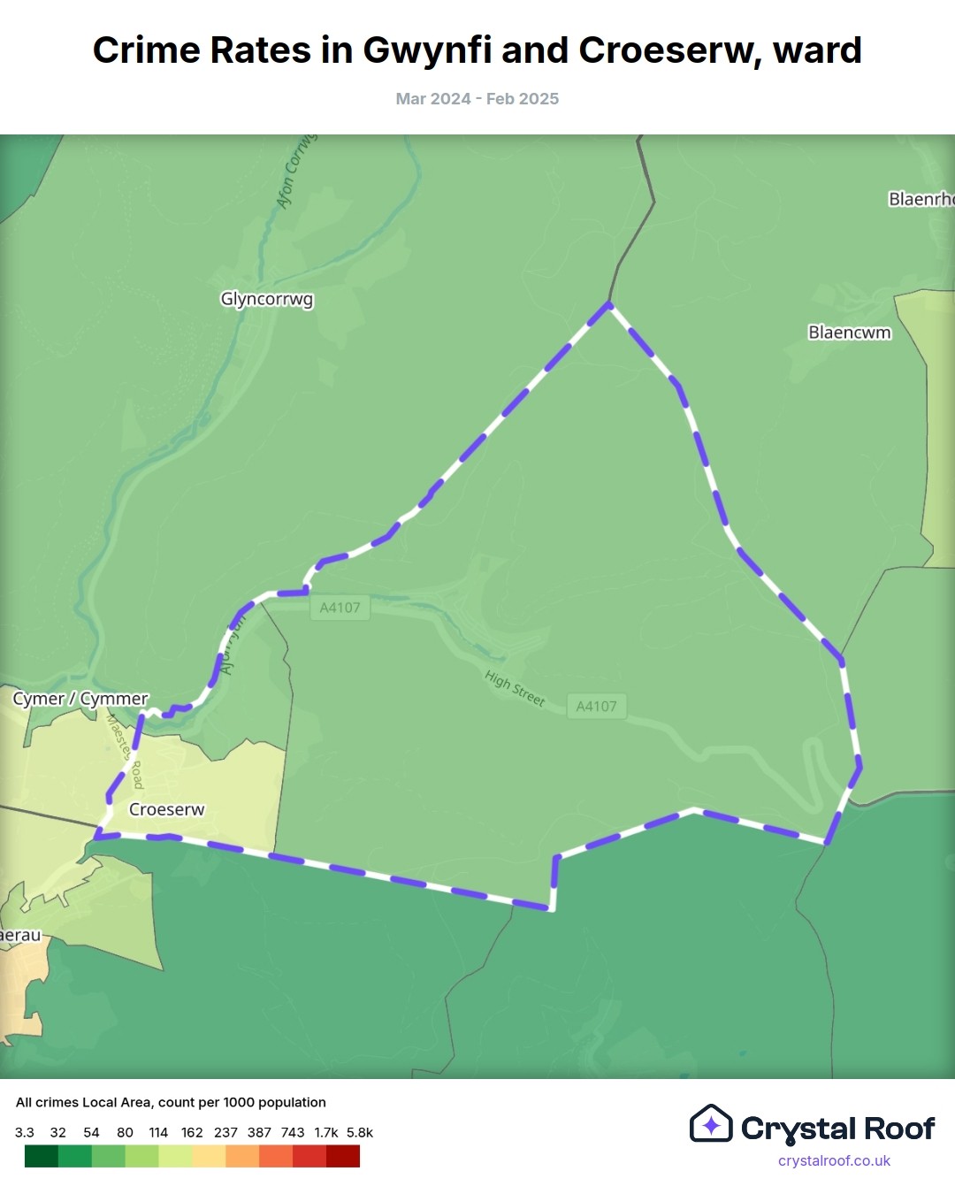 The figures in grey indicate the relative ratings of Gwynfi and Croeserw (ward) for a specific crime type compared to other wards in England and Wales.