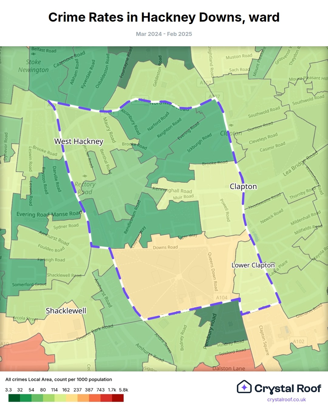 Hackney Downs, (ward) includes areas with the following crime ratings (see map):
