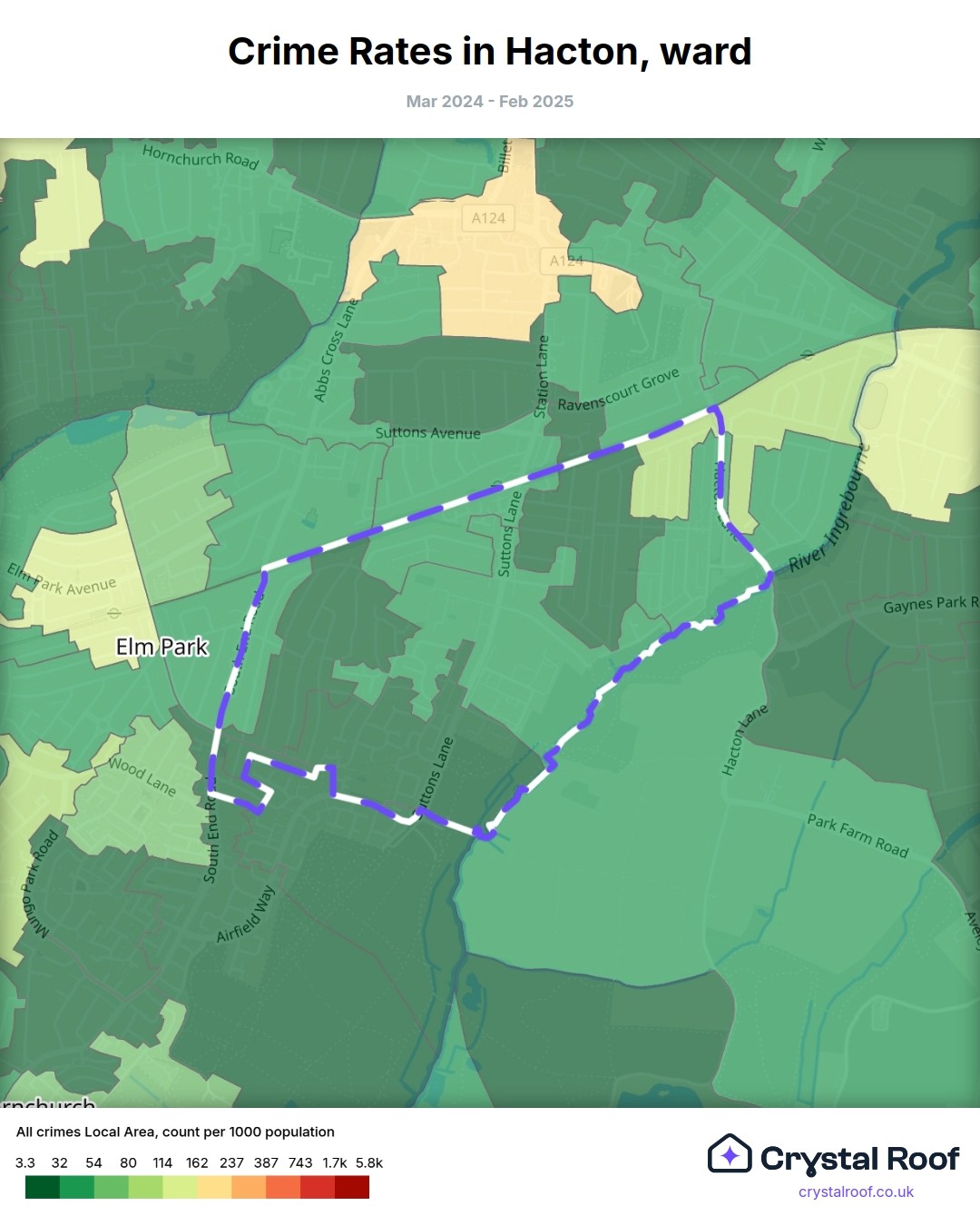 Hacton (ward) is located within Havering (borough). Annual total crime rate in Havering (borough) is 92.9 crimes per thousand resident population, which can be rated as 4 out of 10 or low crime level compared to other local authority districts in England and Wales.