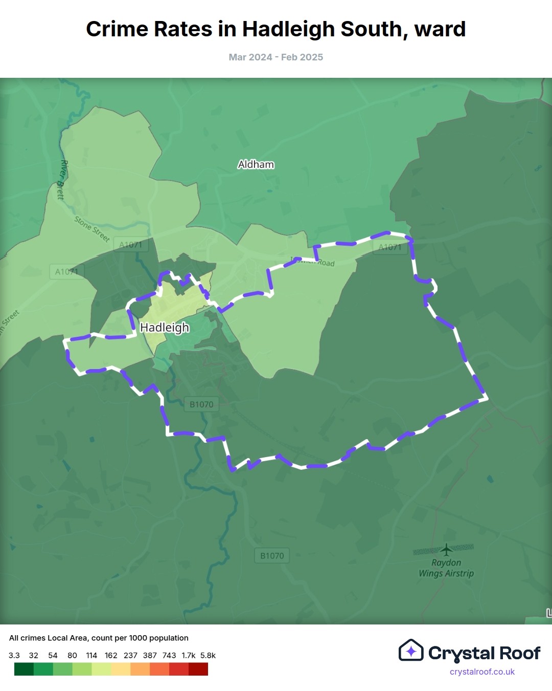 Hadleigh South, (ward) includes areas with the following crime ratings (see map):
