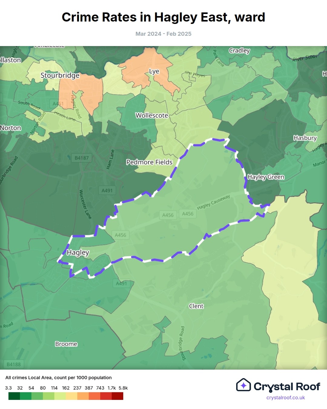 Hagley East, (ward) includes areas with the following crime ratings (see map):