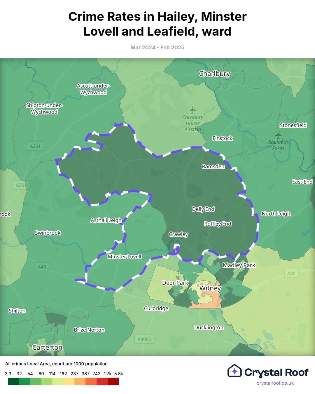 Hailey, Minster Lovell and Leafield, (ward) includes areas with the following crime ratings (see map):