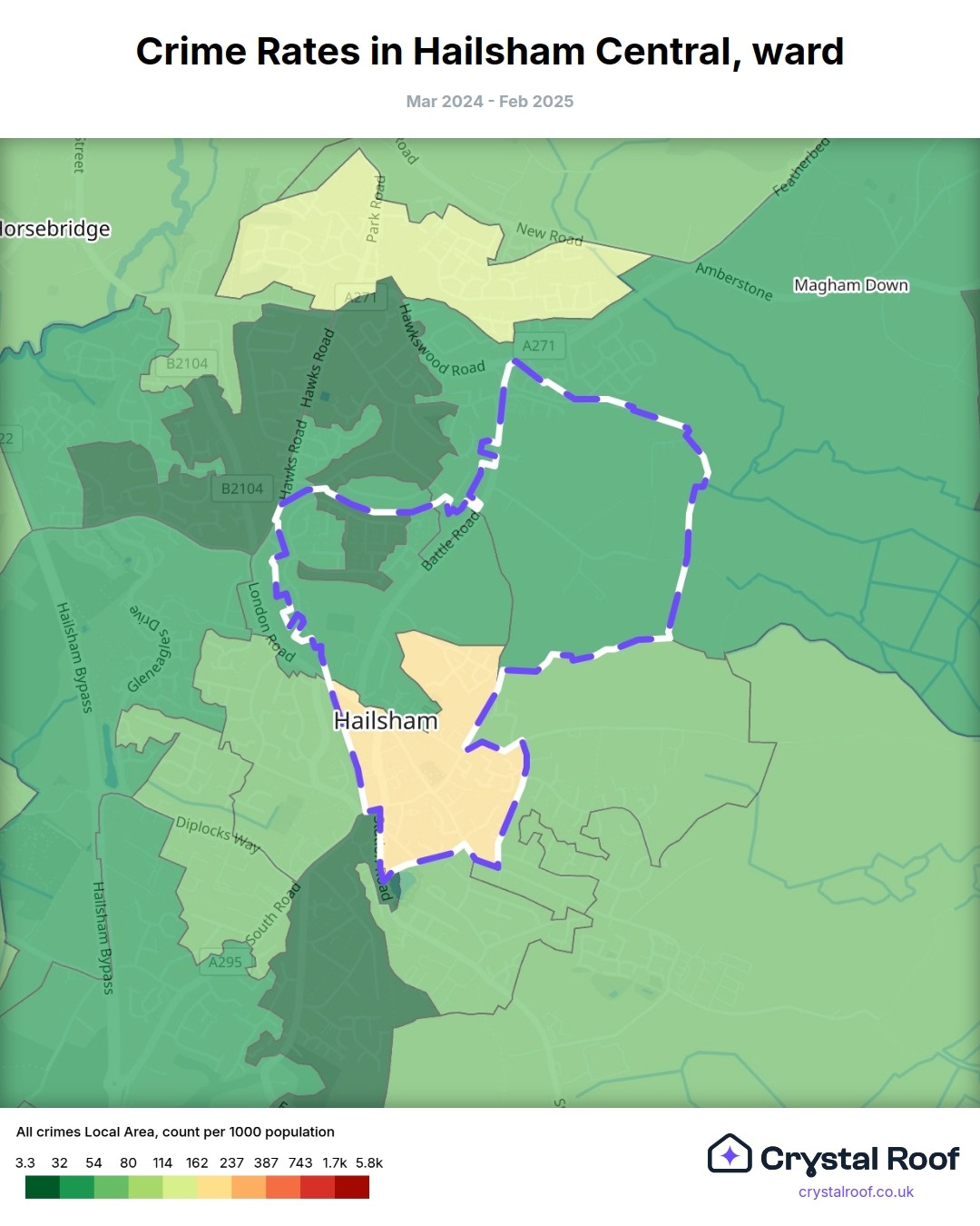 The figures in grey indicate the relative ratings of Hailsham Central (ward) for a specific crime type compared to other wards in England and Wales.