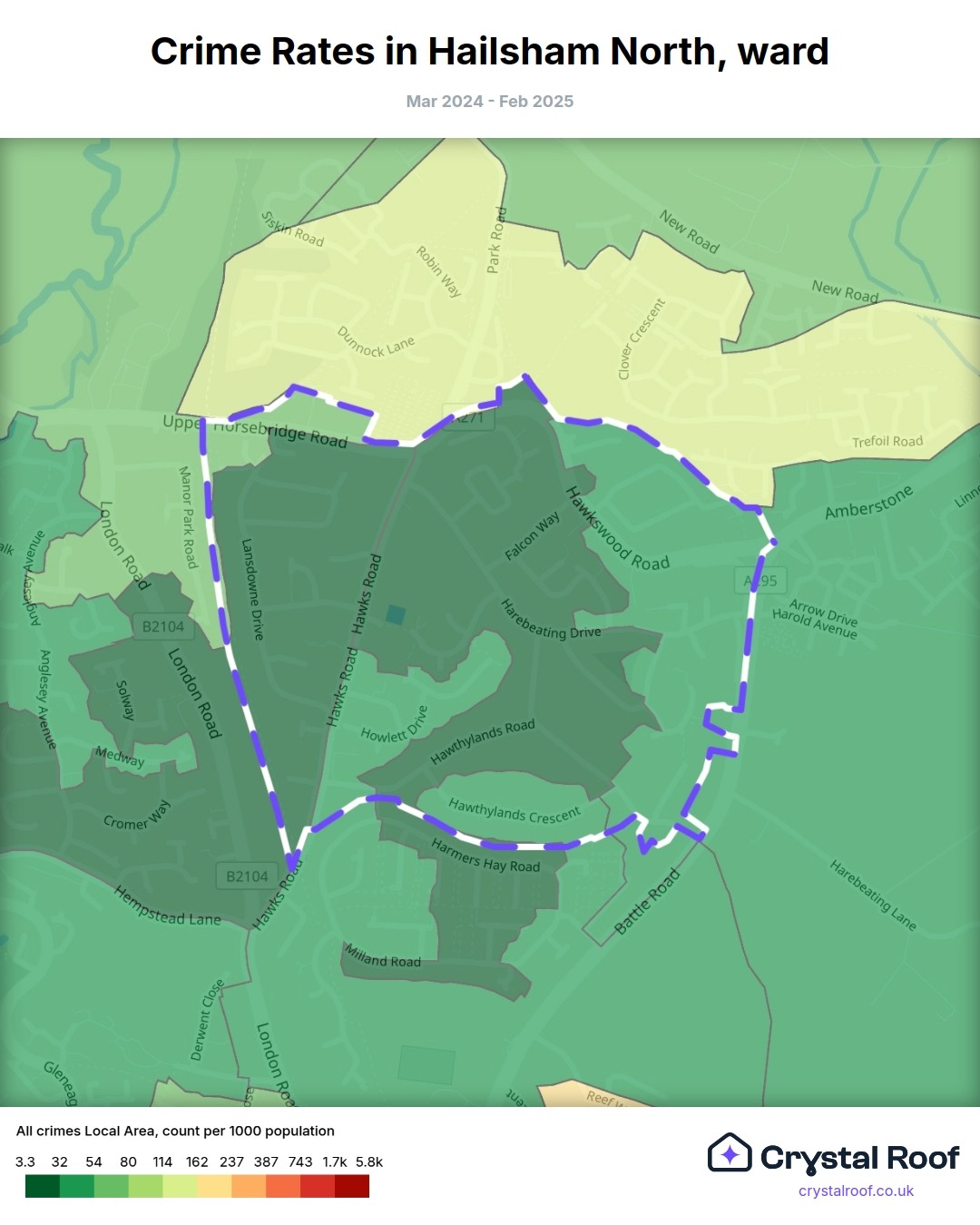 The figures in grey indicate the relative ratings of Hailsham North (ward) for a specific crime type compared to other wards in England and Wales.