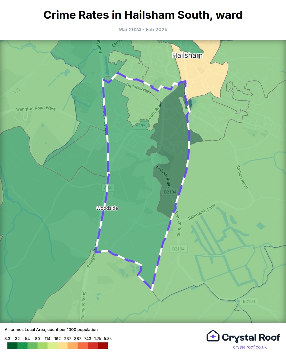 The figures in grey indicate the relative ratings of Hailsham South (ward) for a specific crime type compared to other wards in England and Wales.