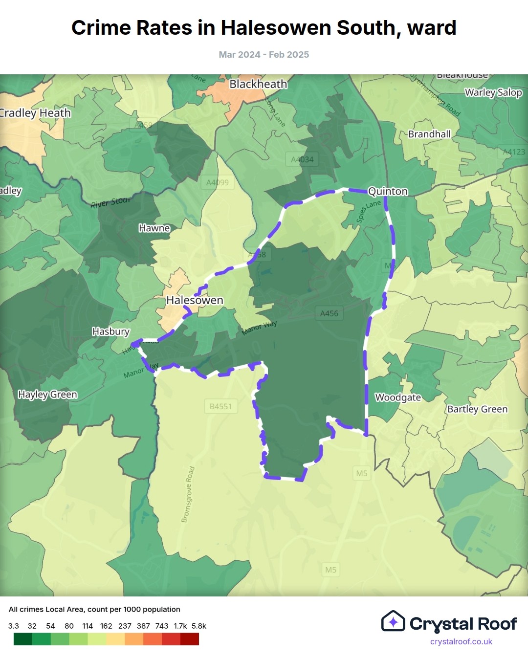 Halesowen South, (ward) includes areas with the following crime ratings (see map):
