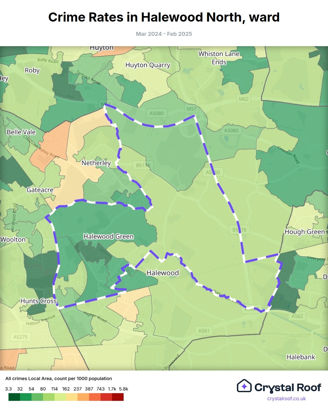 Halewood North, (ward) includes areas with the following crime ratings (see map):