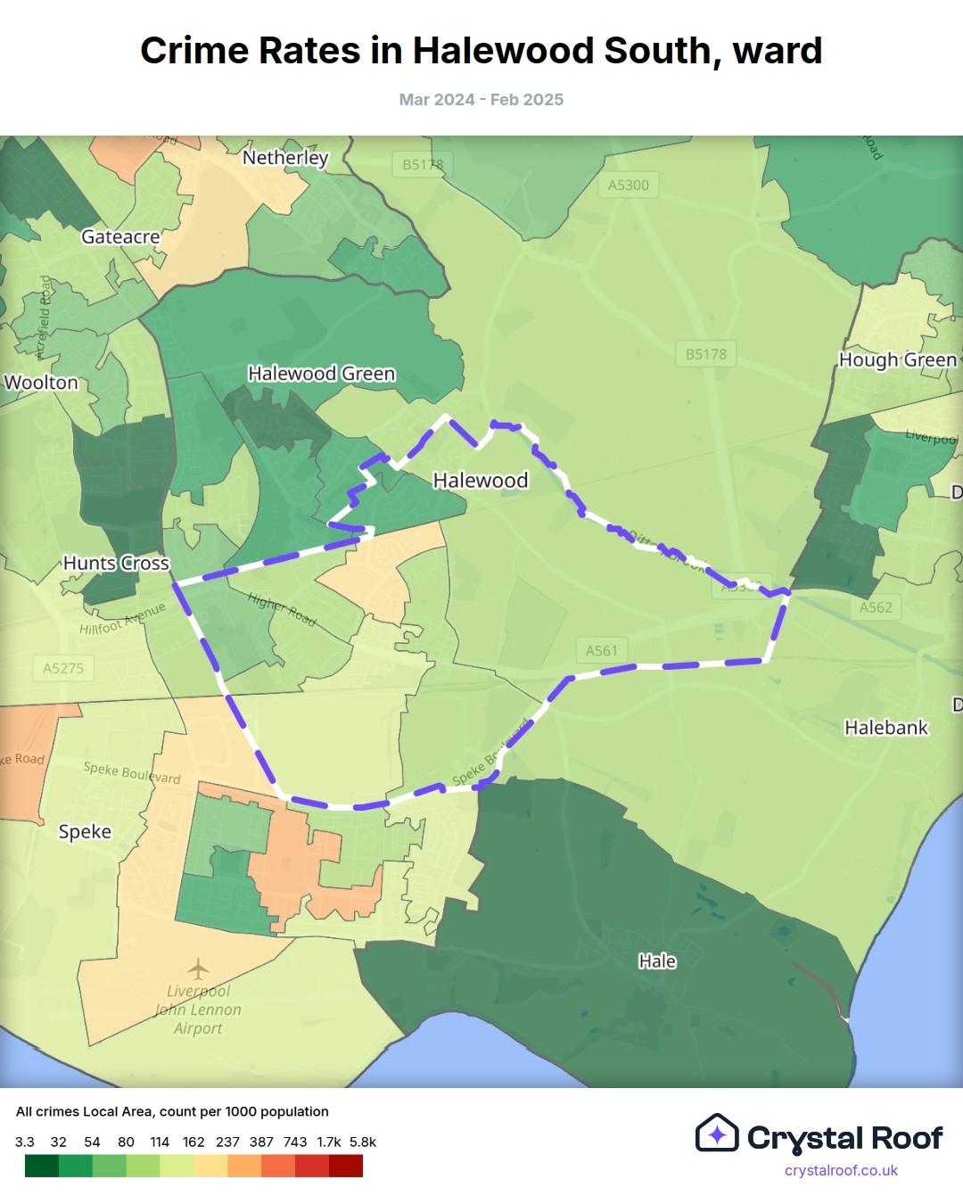 The figures in grey indicate the relative ratings of Halewood South (ward) for a specific crime type compared to other wards in England and Wales.