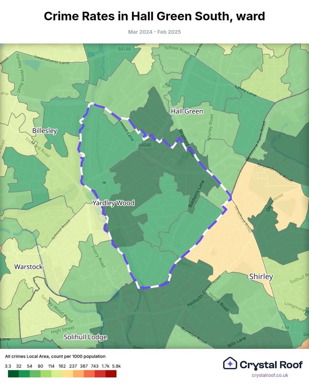 Hall Green South, (ward) includes areas with the following crime ratings (see map):