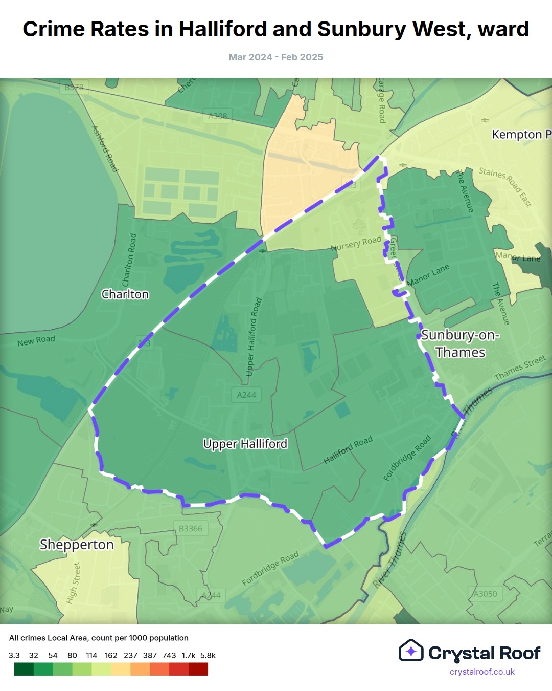 Halliford and Sunbury West, (ward) includes areas with the following crime ratings (see map):